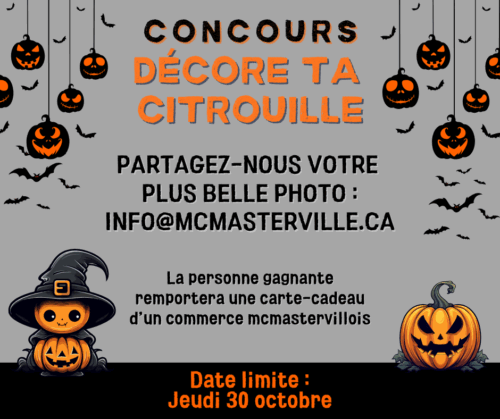 Pour participer au concours, les familles intéressées devront soumettre une photo de leur citrouille décorée et joindre leurs coordonnées complètes par courriel à l’adresse suivante : info@mcmasterville.ca. Une seule photo sera acceptée par adresse.